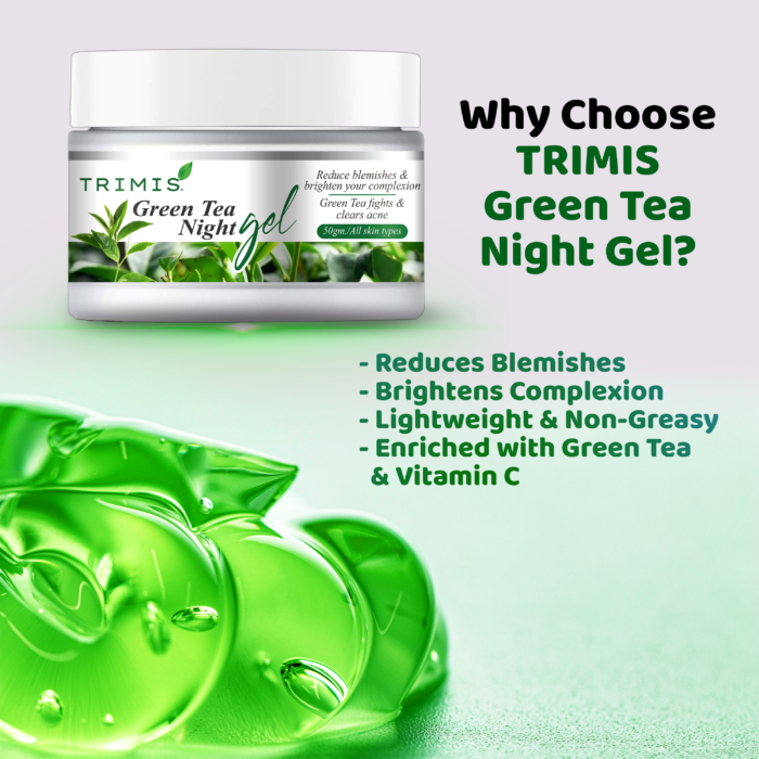 Introducing the TRIMIS Green Tea Night Gel, your go-to solution for clearer, brighter skin. This advanced night gel is specially formulated to work overnight, helping to reduce blemishes and enhance your complexion while you sleep. Infused with powerful natural ingredients like Green Tea Extract and Vitamin C, this gel is designed to fight acne and restore your skin’s natural glow. Green Tea is renowned for its antioxidant properties, which help combat free radicals and soothe the skin. This makes it an essential ingredient in the battle against blemishes and skin imperfections. Paired with Vitamin C, known for its brightening capabilities, this night gel helps diminish dark spots, leaving your skin looking more luminous and even-toned when you wake up. The TRIMIS Green Tea Night Gel is suitable for all skin types, whether you have oily, dry, or combination skin. Its lightweight gel formula absorbs quickly, providing hydration without leaving a greasy residue, ensuring a comfortable night’s sleep. Usage is simple; after cleansing your face, apply a thin layer of the night gel to your face and neck. Allow the gel to penetrate your skin as you relax and sleep. You’ll wake up to a refreshed, rejuvenated complexion that radiates health and vitality. With a net weight of 50 grams, the TRIMIS Green Tea Night Gel is designed to integrate easily into your nighttime skincare routine, providing you with the pampering your skin deserves. Say goodbye to blemishes and hello to a brighter, smoother, and more youthful-looking complexion with the TRIMIS Green Tea Night Gel. Experience the difference overnight and embrace the beauty of radiant skin every morning!