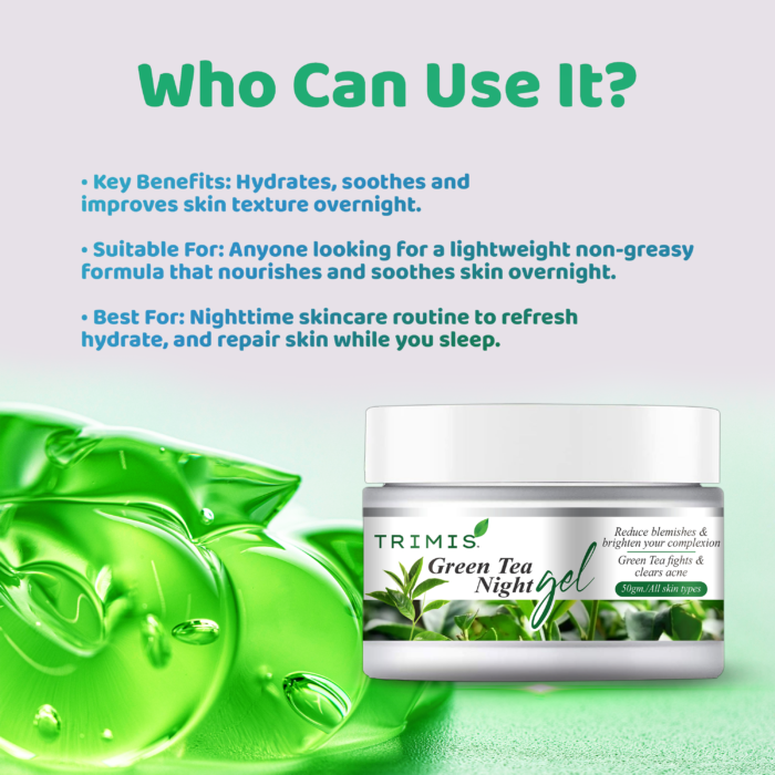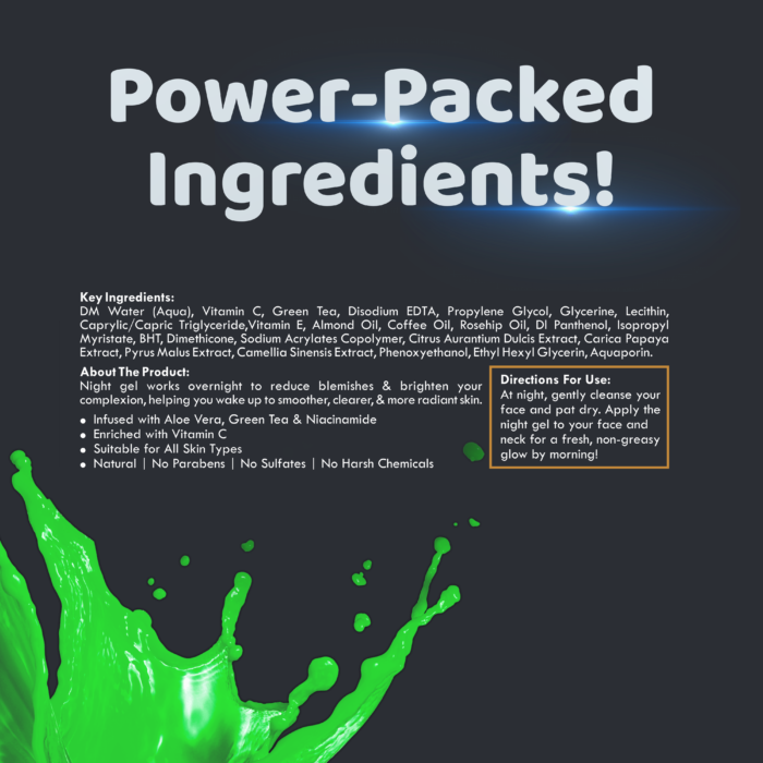 - – Blemish Reduction: Formulated to target blemishes overnight, helping you wake up to a clearer, more even complexion. – Brightening Benefits: Enriched with Vitamin C to enhance your skin’s radiance and brightness, providing a youthful glow. – Natural Ingredients: Harnesses the power of Green Tea to fight free radicals and clear acne, promoting overall skin health. – Suitable for All Skin Types: Gentle yet effective, this night gel works well for oily, dry, and combination skin types. – Easy Application: Simply apply the gel to a clean face and neck before bed for a fresh, luminous look by morning.