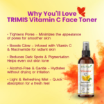 TRIMIS Vitamin C Face Toner is a premium skincare essential designed to hydrate, refresh, and revitalize your skin. This gentle, alcohol-free toner is enriched with Vitamin C, Niacinamide, and botanical extracts to balance your skin’s pH levels, minimize the appearance of pores, and prepare your skin for better absorption of serums and moisturizers. Formulated with natural ingredients like Aloe Vera, Witch Hazel, Cucumber, and Tea Tree Extracts, this toner deeply nourishes the skin while helping to remove excess oil, dirt, and impurities. Vitamin C brightens and evens skin tone, while Niacinamide enhances the skin’s natural barrier and reduces dark spots and blemishes. The Hibiscus and Chamomile extracts provide soothing and anti-inflammatory benefits, making this toner ideal for all skin types, including sensitive skin. This lightweight, non-sticky toner absorbs quickly into the skin, leaving it soft, supple, and refreshed. Regular use helps maintain a healthy, glowing complexion, controls excess oil, and enhances the effectiveness of your skincare routine. Free from alcohol, parabens, sulfates, and artificial dyes, TRIMIS Vitamin C Face Toner is a pure and natural choice for skincare enthusiasts. Why Choose TRIMIS Vitamin C Face Toner? Alcohol-Free Formula: Gentle on the skin and perfect for daily use. Infused with Natural Botanicals: Aloe Vera, Tea Tree, Cucumber, and Witch Hazel for hydration & soothing effects. Enriched with Vitamin C & Niacinamide: Helps in brightening, toning, and reducing dark spots. Tightens Pores & Balances pH: Controls oil production and maintains skin health. Free from Harsh Chemicals: No parabens, sulfates, silicones, or artificial fragrances. Perfect for All Skin Types: Suitable for oily, dry, combination, and sensitive skin. How to Use: Cleanse your face thoroughly. Pour a small amount of toner onto a cotton pad. Dab gently all over the face—do not rub. Let it air dry and follow up with a serum or moisturizer for best results. Use daily for refreshed and hydrated skin. Experience the power of nature with TRIMIS Vitamin C Face Toner – Your perfect skincare companion for a radiant, youthful glow!