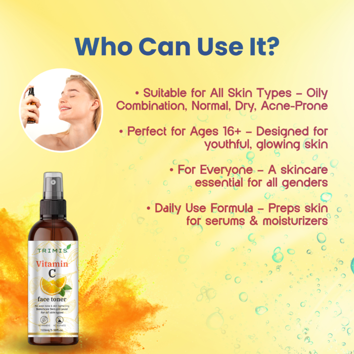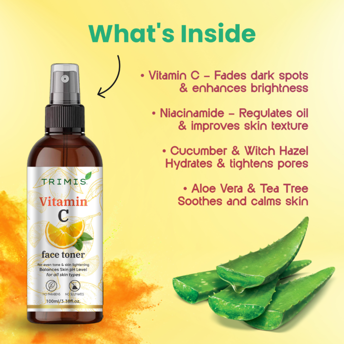 TRIMIS Vitamin C Face Toner is a premium skincare essential designed to hydrate, refresh, and revitalize your skin. This gentle, alcohol-free toner is enriched with Vitamin C, Niacinamide, and botanical extracts to balance your skin’s pH levels, minimize the appearance of pores, and prepare your skin for better absorption of serums and moisturizers. Formulated with natural ingredients like Aloe Vera, Witch Hazel, Cucumber, and Tea Tree Extracts, this toner deeply nourishes the skin while helping to remove excess oil, dirt, and impurities. Vitamin C brightens and evens skin tone, while Niacinamide enhances the skin’s natural barrier and reduces dark spots and blemishes. The Hibiscus and Chamomile extracts provide soothing and anti-inflammatory benefits, making this toner ideal for all skin types, including sensitive skin. This lightweight, non-sticky toner absorbs quickly into the skin, leaving it soft, supple, and refreshed. Regular use helps maintain a healthy, glowing complexion, controls excess oil, and enhances the effectiveness of your skincare routine. Free from alcohol, parabens, sulfates, and artificial dyes, TRIMIS Vitamin C Face Toner is a pure and natural choice for skincare enthusiasts. Why Choose TRIMIS Vitamin C Face Toner? Alcohol-Free Formula: Gentle on the skin and perfect for daily use. Infused with Natural Botanicals: Aloe Vera, Tea Tree, Cucumber, and Witch Hazel for hydration & soothing effects. Enriched with Vitamin C & Niacinamide: Helps in brightening, toning, and reducing dark spots. Tightens Pores & Balances pH: Controls oil production and maintains skin health. Free from Harsh Chemicals: No parabens, sulfates, silicones, or artificial fragrances. Perfect for All Skin Types: Suitable for oily, dry, combination, and sensitive skin. How to Use: Cleanse your face thoroughly. Pour a small amount of toner onto a cotton pad. Dab gently all over the face—do not rub. Let it air dry and follow up with a serum or moisturizer for best results. Use daily for refreshed and hydrated skin. Experience the power of nature with TRIMIS Vitamin C Face Toner – Your perfect skincare companion for a radiant, youthful glow!